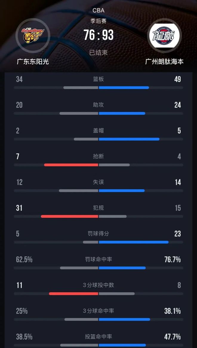 4月28日,CBA季后赛12进8比赛首回合,广东东阳光将坐镇主场迎战广州朗肽海本,最终广州队以93比76战胜广东队,拿下季后赛首回合胜利。