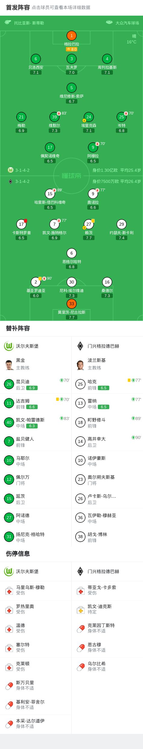 沃尔夫斯堡0-0门兴格拉德巴赫,卡斯特罗普染红